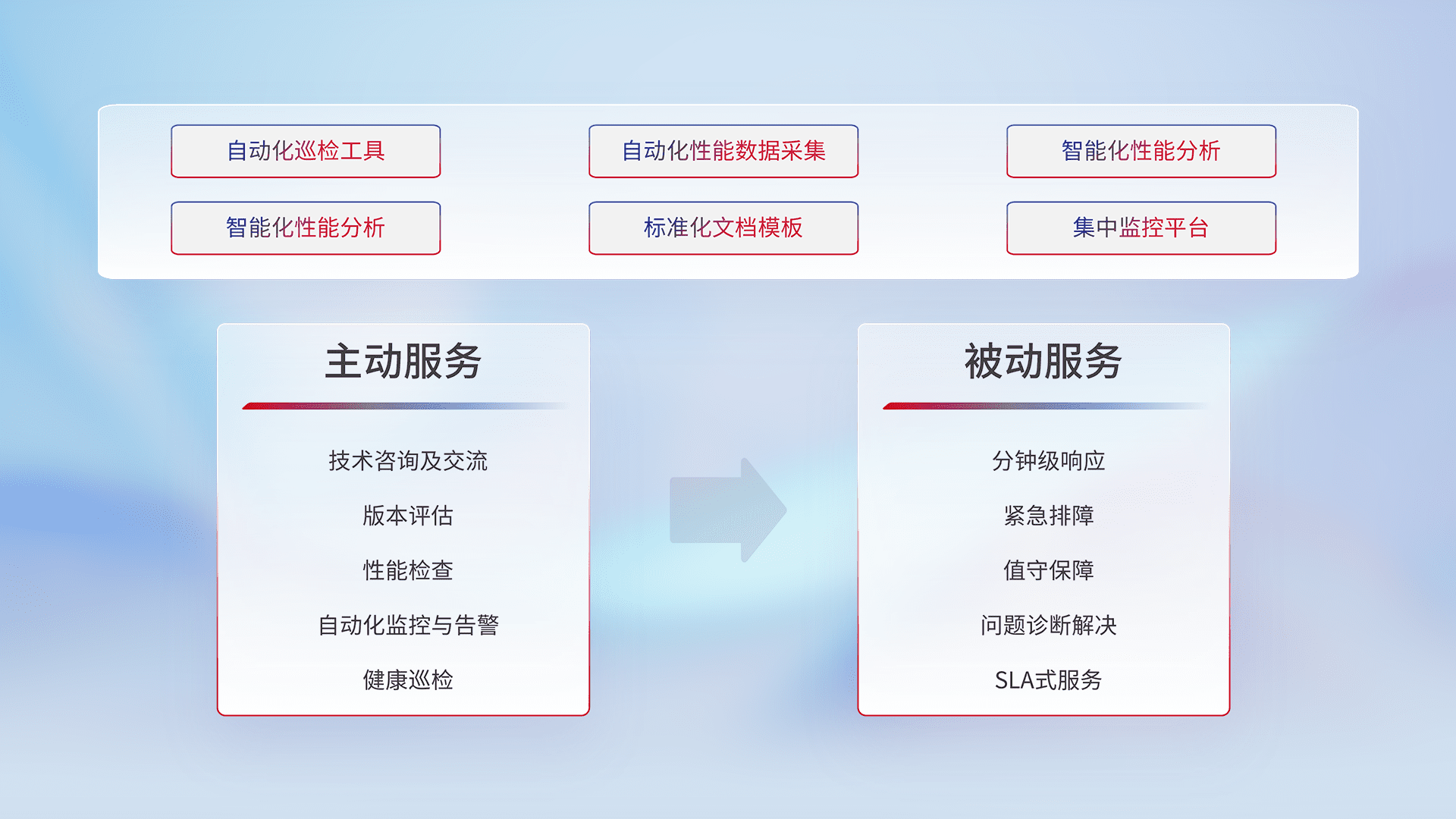 智能化工具和标准化文档,,,保障服务质量,,提供主动服务(包含技术咨询、、版本评估、、、性能检查、、、自动化监控与告警、、、健康巡检)和被动服务包含(分钟级响应、、紧急排障、、值守保障、、问题诊断解决、、SLA服务)。。。